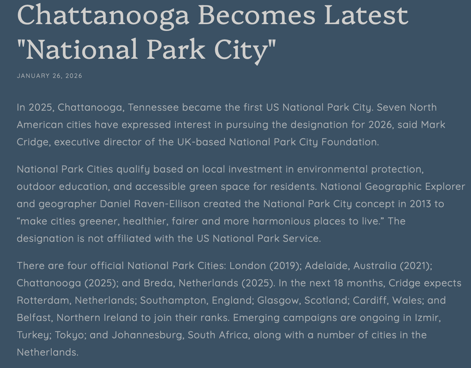 In 2025, Chattanooga, Tennessee became the first US National Park City. Seven North American cities have expressed interest in pursuing the designation for 2026, said Mark Cridge, executive director of the UK-based National Park City Foundation.